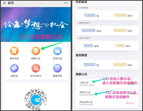 点击首页中的“提额认证”进行商户使用额度的提高。